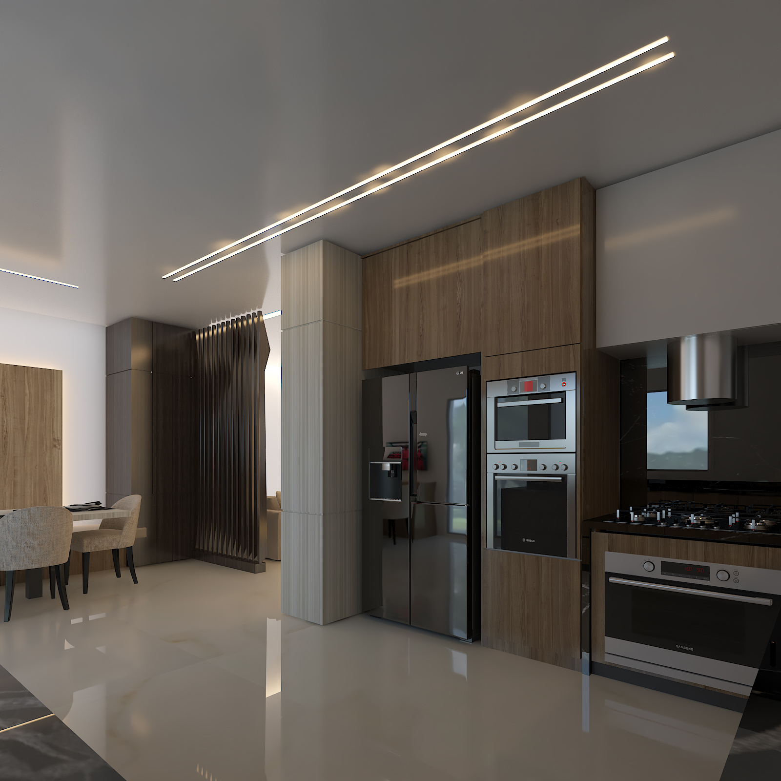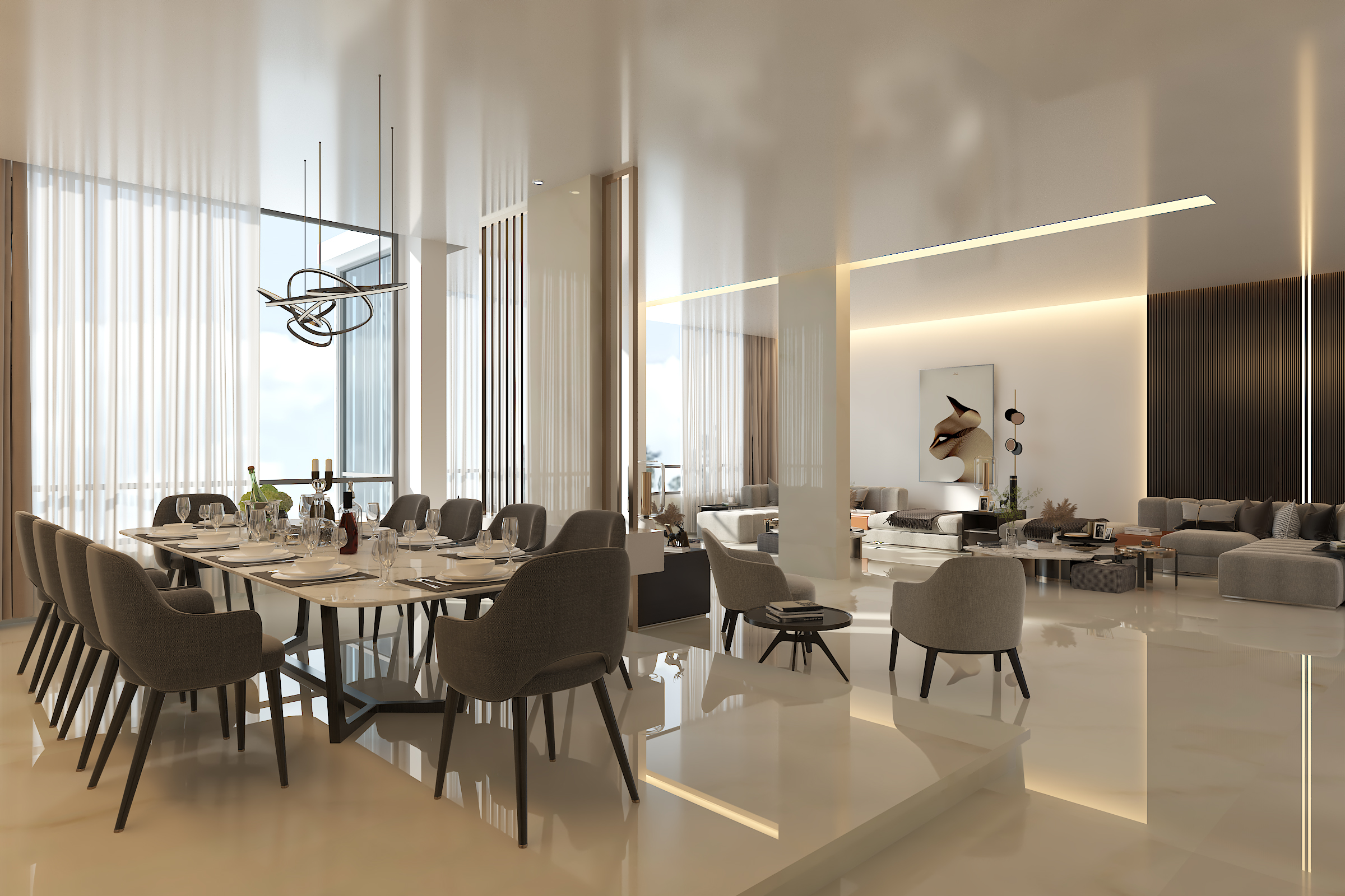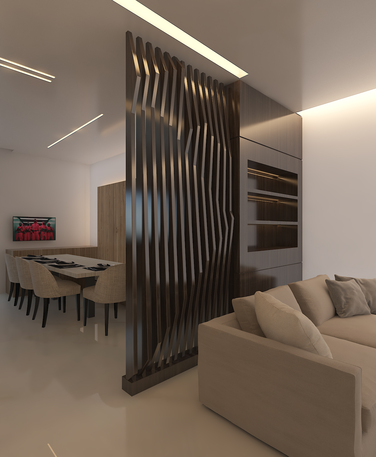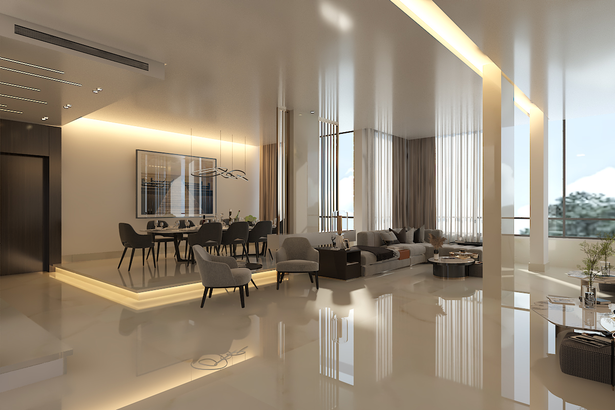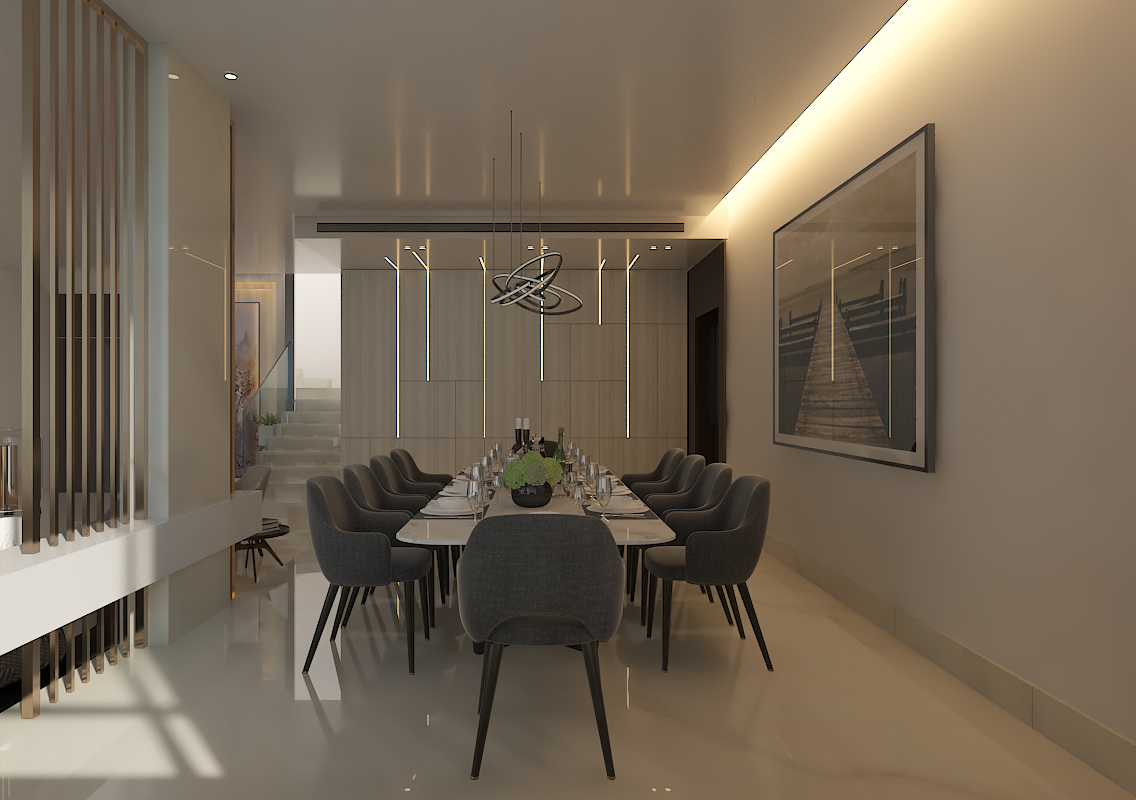 This project showcases a refined modern interior designed to create a seamless flow between the dining and living areas. The space features a warm, minimalist aesthetic highlighted by clean lines, soft lighting, and a sophisticated material palette.