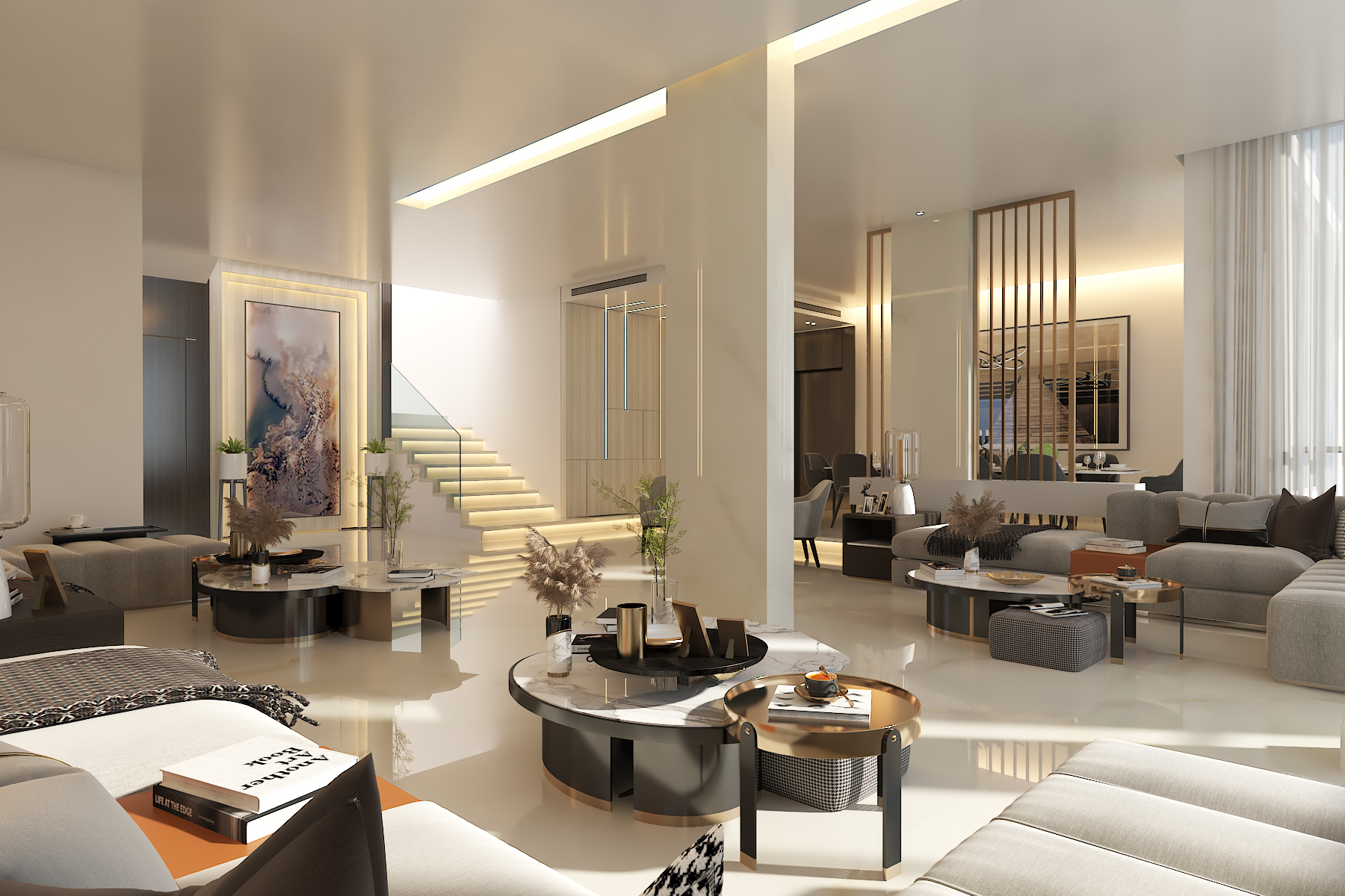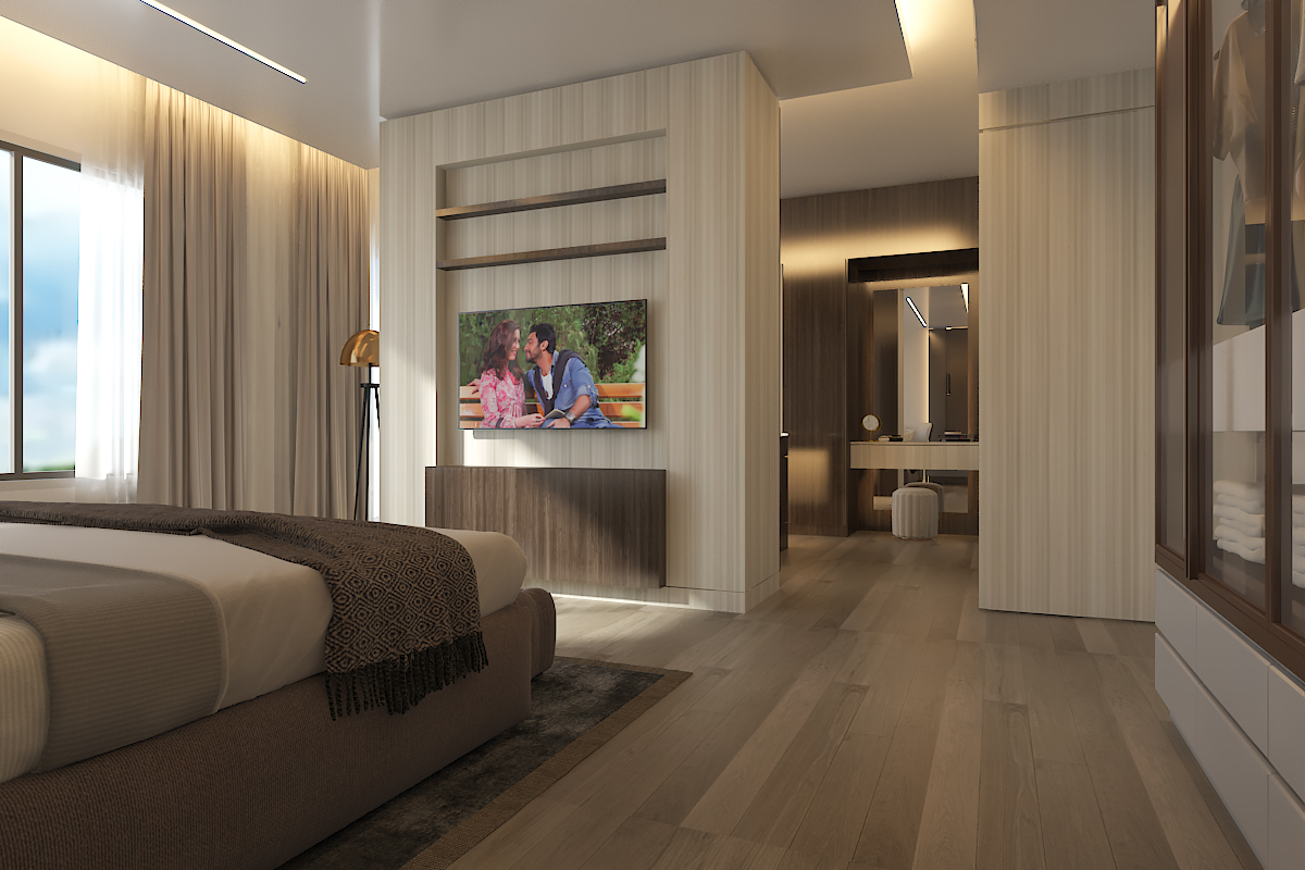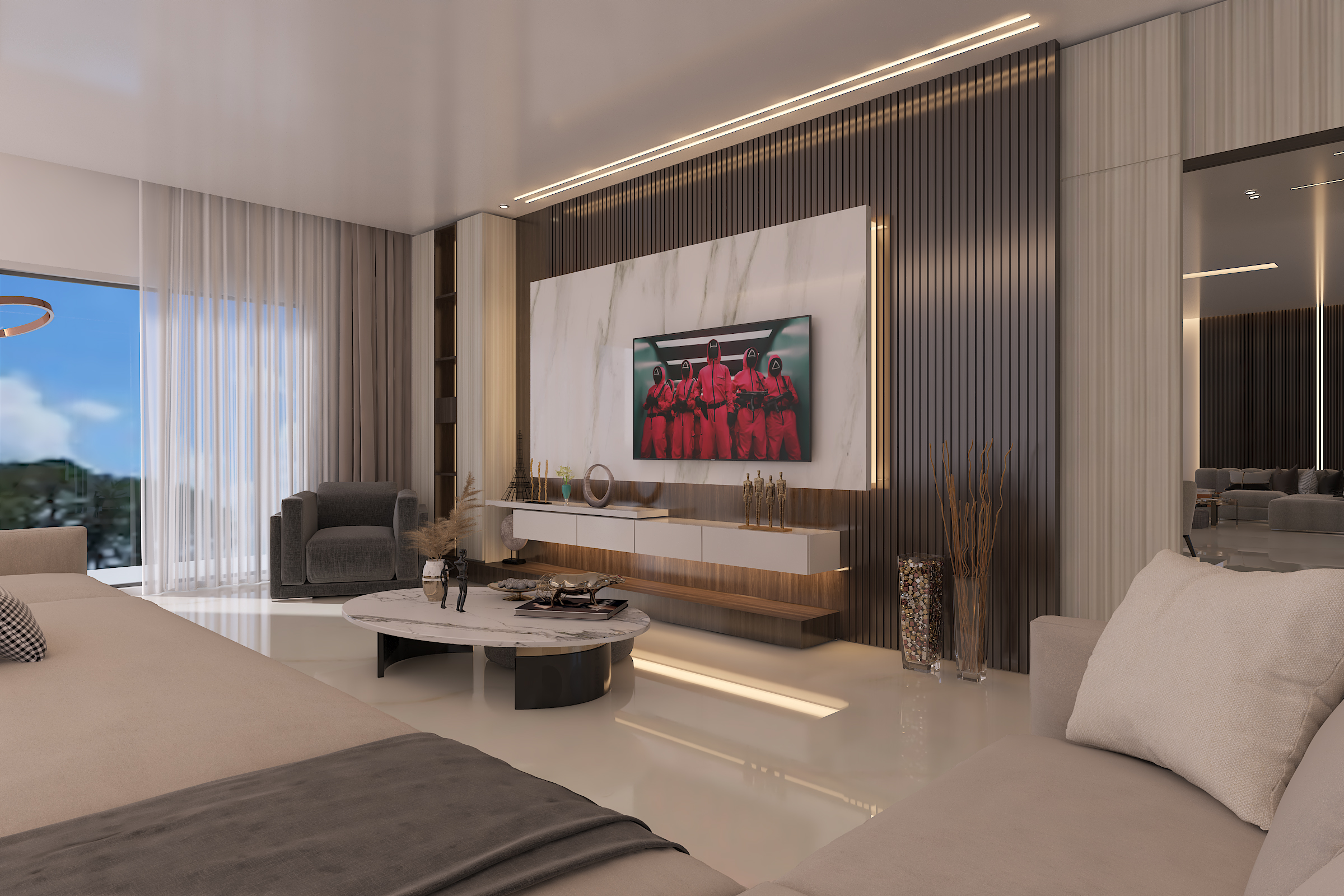 In the living area, the design emphasizes relaxation and contemporary luxury, with a spacious layout, layered textures, and a neutral color scheme that complements the architectural form.