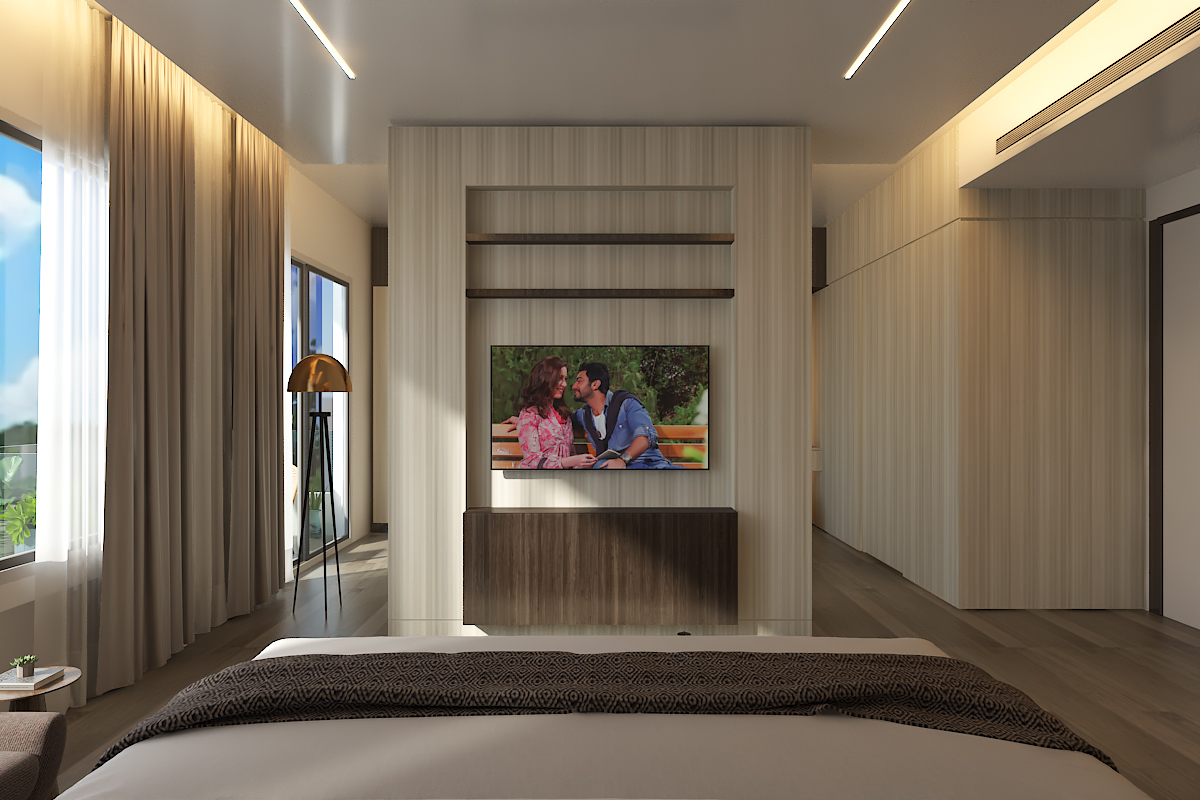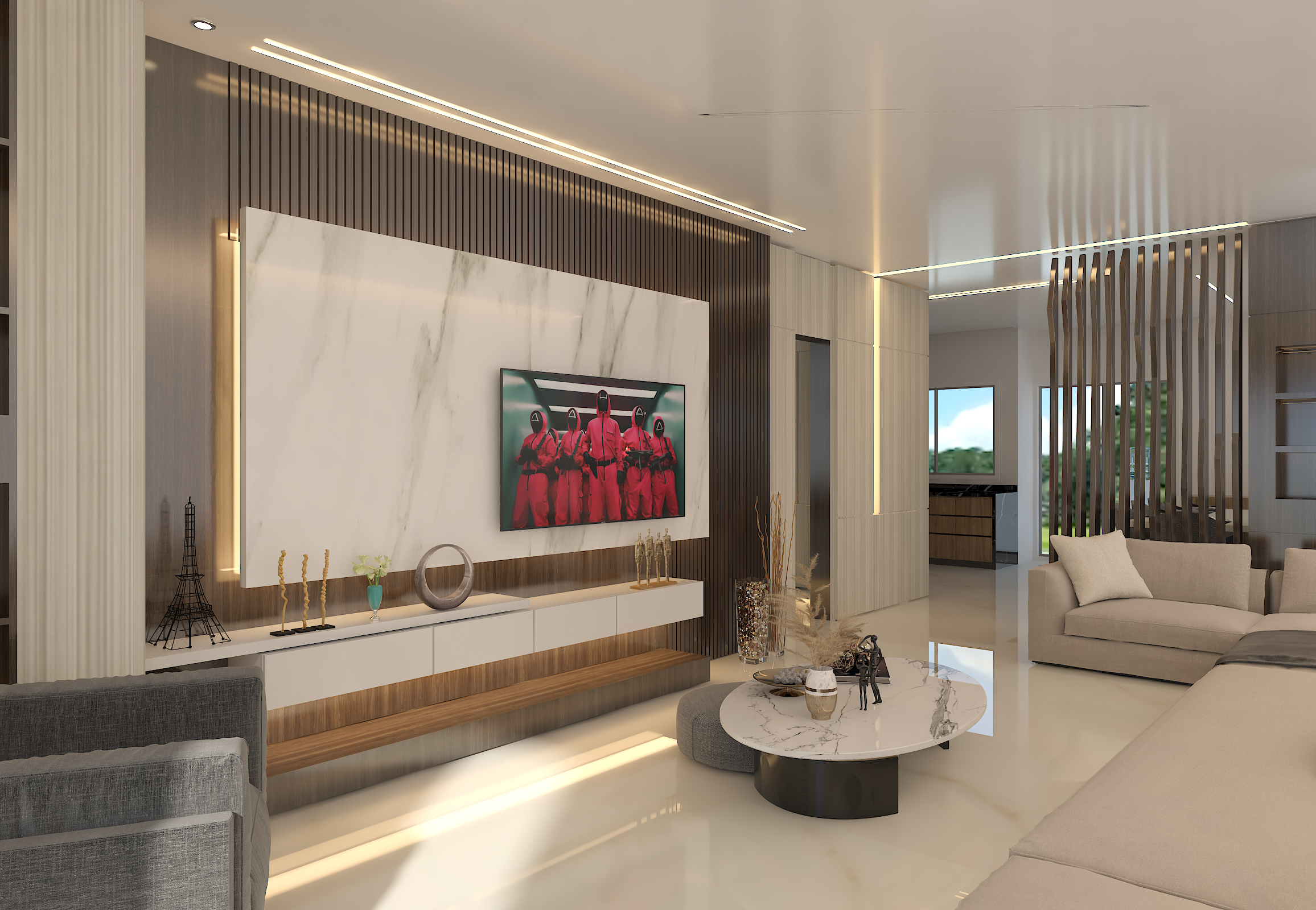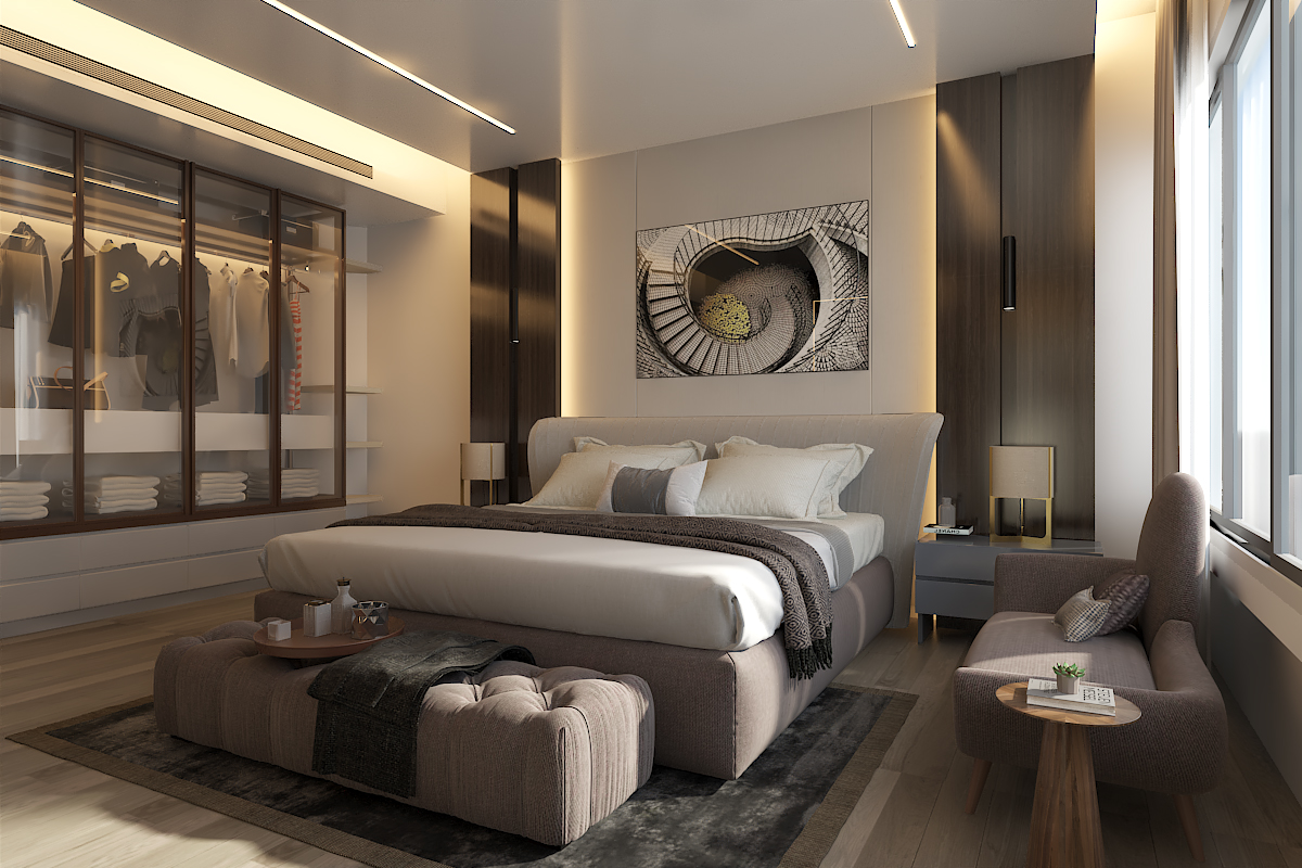 In the living area, the design emphasizes relaxation and contemporary luxury, with a spacious layout, layered textures, and a neutral color scheme that complements the architectural form.