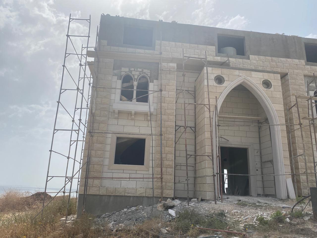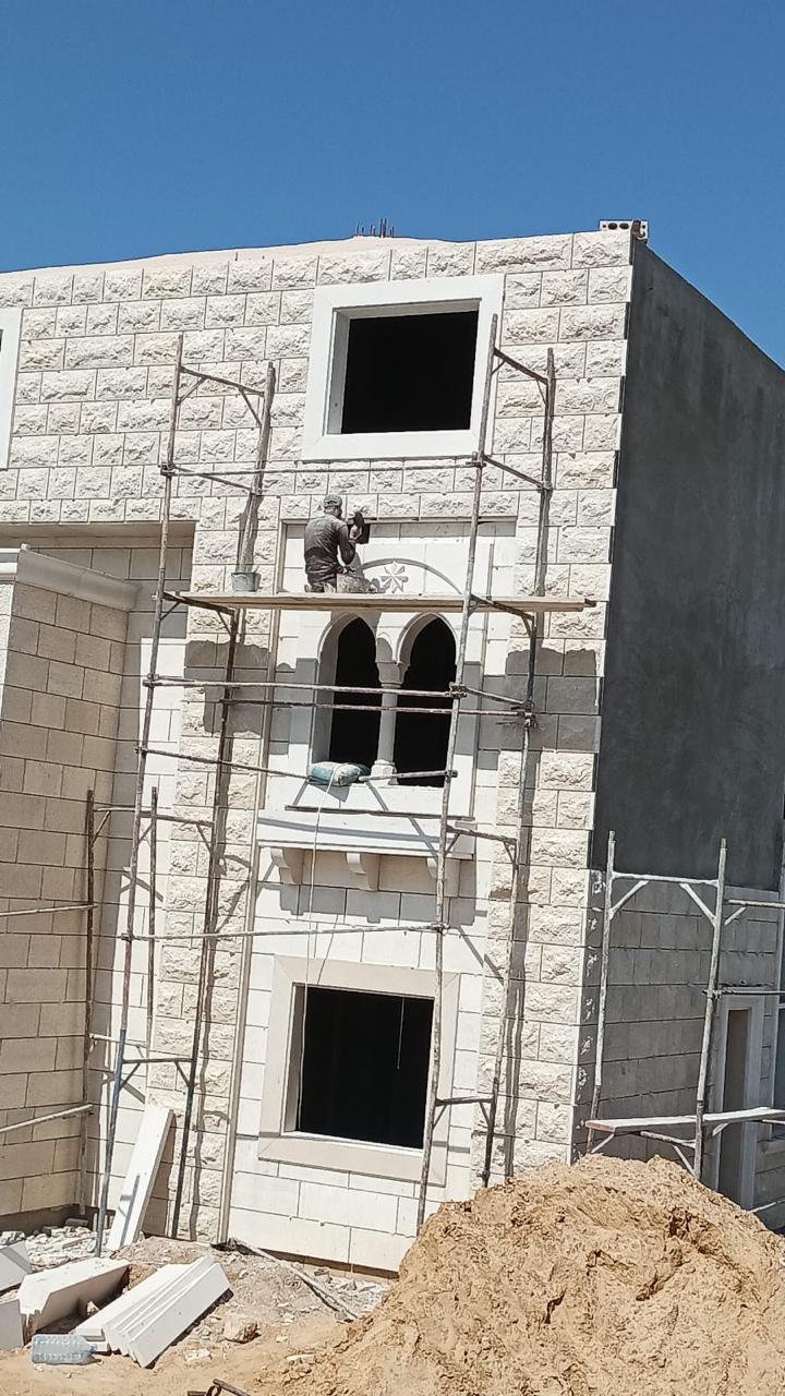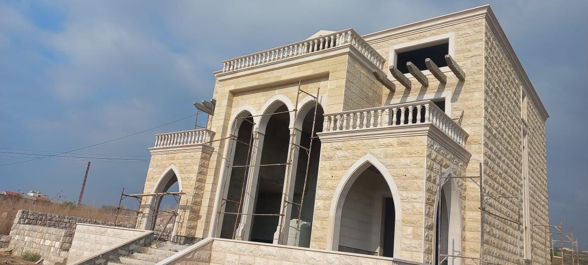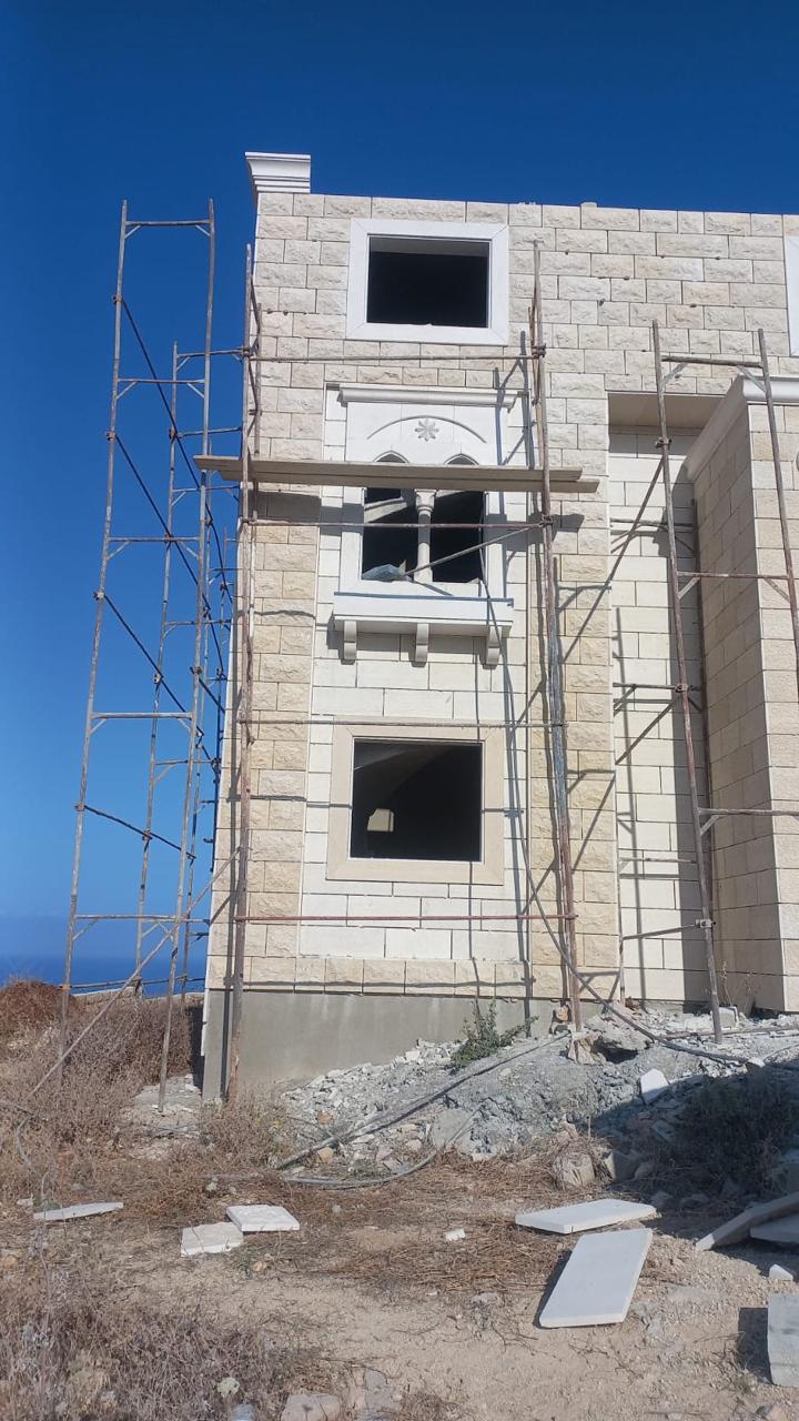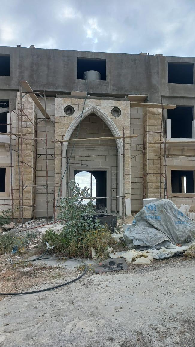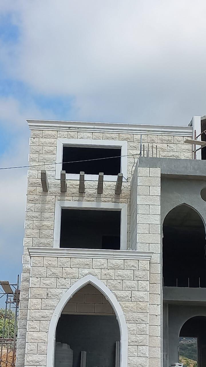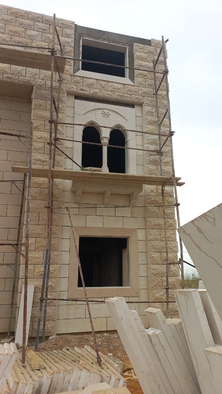 This stunning villa showcases a refined blend of Mediterranean and contemporary architecture, highlighted by clean geometric lines, warm natural stone cladding, and a grand arched entrance that creates a striking focal point. Designed with meticulous attention to detail, the façade features symmetrical windows framed with decorative elements, lush greenery, and custom ironwork that elevates the home’s character and charm.
